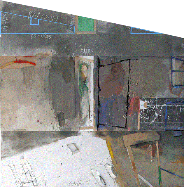Technik: Dispersion, Öl, div. Materialien/Assemblage auf cachierter Leinwand